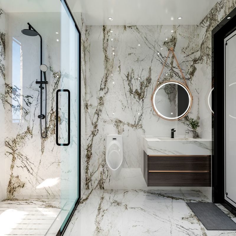| Panneaux Muraux et de Sol | Marbre veiné blanc et noir, rehaussant l'esthétique générale avec une touche de luxe |