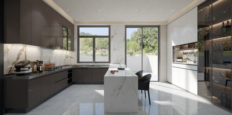 La disposition et les tiroirs profonds et les armoires spacieuses avec des mécanismes de fermeture en douceur font partie de la même composition, ce qui aide les concepteurs et les développeurs à juger comment le système va lire une fois les appareils,des comptoirs, et l'éclairage sont en place.