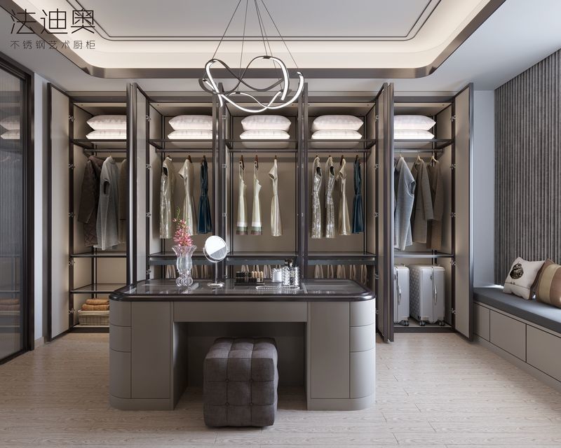 Cette garde-robe est présentée comme un système axé sur la conception plutôt qu'une référence générique. Elle utilise une palette de finitions contrôlée associée à une structure de caisson en acier inoxydable premium pour créer une identité visuelle plus aboutie pour les projets résidentiels haut de gamme.