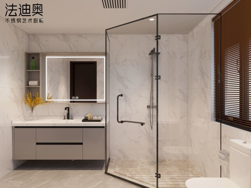 Cette vanité de salle de bain est présentée comme un système de conception plutôt qu'un SKU générique.Il utilise le gris avec la structure de l'armoire en acier inoxydable Premium pour créer une identité visuelle plus résolue pour les projets résidentiels premium.