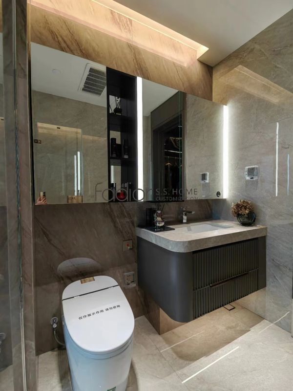 Cette vanité de salle de bain est présentée comme un système de conception plutôt qu'un SKU générique.Il utilise une palette de finitions contrôlées avec la structure de l'armoire en acier inoxydable pour créer une identité visuelle plus résolue pour les projets résidentiels haut de gamme.