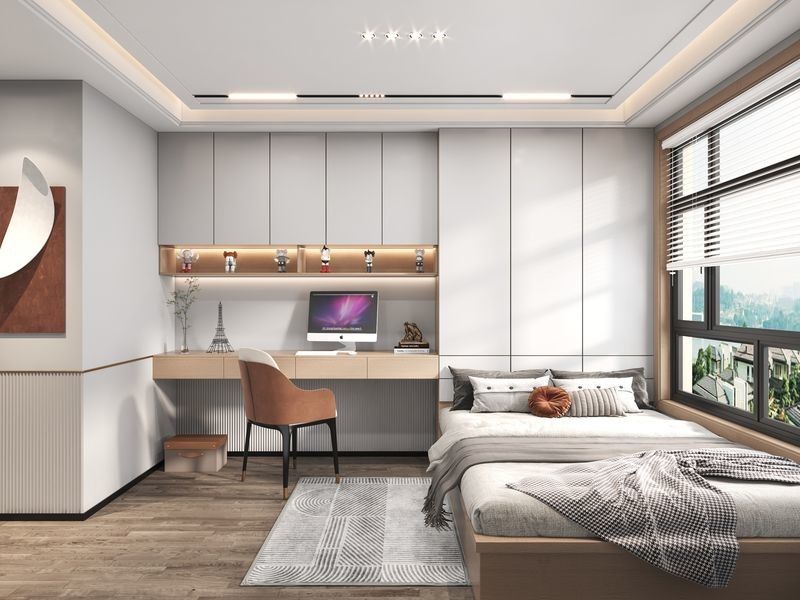 | Espace de Travail | Espace bureau intégré avec une surface de travail spacieuse et des étagères pour livres et décorations, créant un espace dédié |