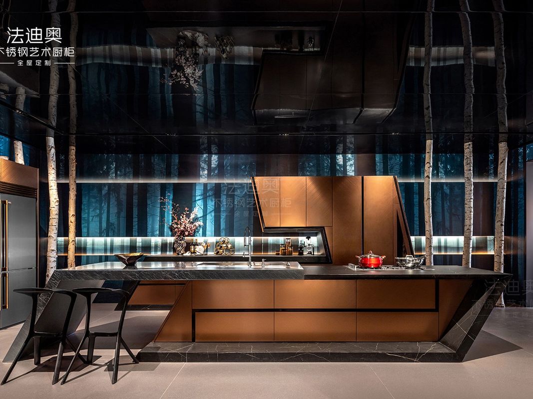 Cette armoire de cuisine personnalisée est construite autour d'une stratégie de finition différenciée : l'or rose associé à une structure d'armoire en acier inoxydable. Cette combinaison offre aux acheteurs une expression de luxe plus chaleureuse sans perdre la facilité de nettoyage et la durabilité du projet attendues des armoires en acier inoxydable.