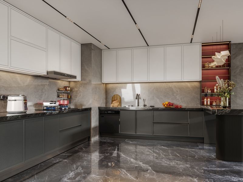 Cette armoire de cuisine est présentée comme un système basé sur la conception plutôt que comme un SKU générique.Il utilise le blanc / noir avec la structure de l'armoire en acier inoxydable Premium pour créer une identité visuelle plus résolue pour les projets résidentiels premium.