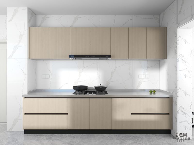 Cette armoire de cuisine sur mesure est construite autour d'une stratégie de finition différenciée: Grain de bois associé à la structure de l'armoire en acier inoxydable Premium.Cette combinaison donne aux acheteurs une expression de luxe plus chaleureuse sans perdre la propreté et la durabilité du projet attendus des armoires en acier inoxydable.