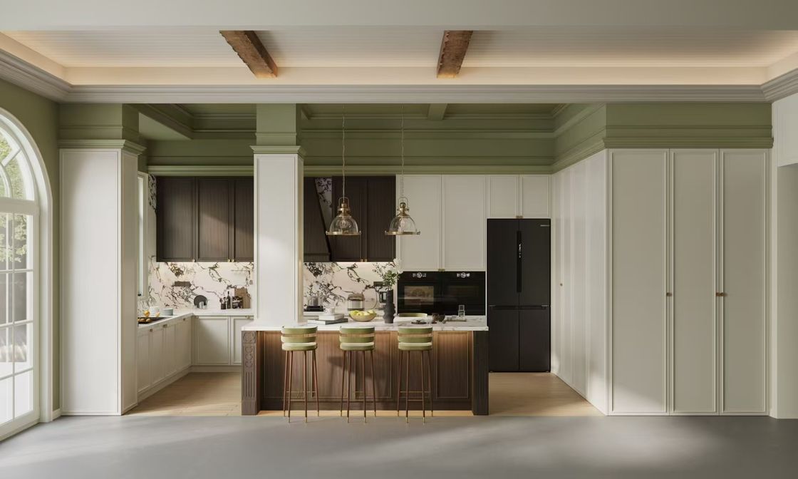 | Intégration au plafond | Convient aux schémas de plafond de style français vert sauge ou vert ; moulures en acier inoxydable de couleur disponibles |