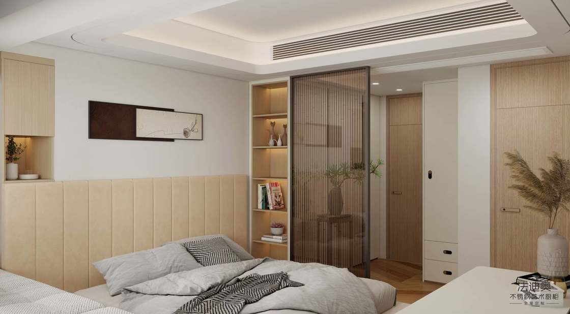 Cette garde-robe est présentée comme un système axé sur le design plutôt qu'une référence générique. Elle utilise le Beige / Gris associé à une structure d'armoire en acier inoxydable pour créer une identité visuelle plus aboutie pour les projets résidentiels haut de gamme.