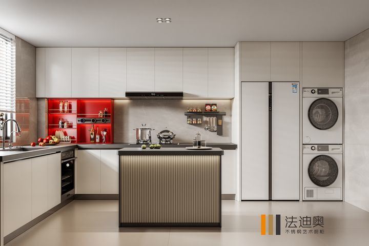 Cette armoire de cuisine est présentée comme un système axé sur la conception plutôt qu'une référence générique. Elle utilise le blanc associé à une structure d'armoire en acier inoxydable pour créer une identité visuelle plus aboutie pour les projets résidentiels haut de gamme.