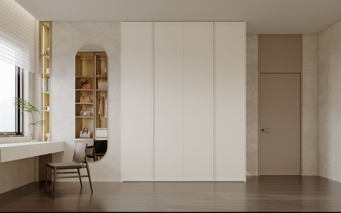 Design de garde-robe minimaliste contemporain combinant des lignes architecturales propres avec des textures de matériaux chauds et des tons de couleurs neutres doux. |