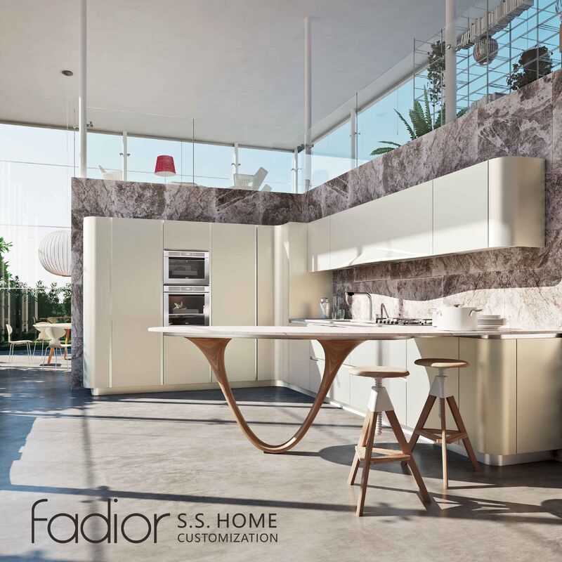 Soft cream cabinetry, sculptural curves, and dramatic stone surfaces define this contemporary kitchen by Fadior. Inspired by modern architectural interiors, the design emphasizes fluid lines and visual harmony within an open, light-filled environment. The curved cabinet edges soften the overall space, while the elegant breakfast table extends the kitchen into a social and dining hub. Behind the refined appearance lies Fadior’s precision stainless steel cabinet system, engineered for exceptional resistance to humidity, heat, and long-term wear. Integrated appliances and minimalist storage maintain a seamless look, creating a sophisticated kitchen that blends artistic design with the durability of stainless steel cabinetry.