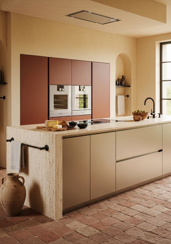 laque mate couleur terre cuite sur certaines façades / comptoir en travertin naturel poli / accents |