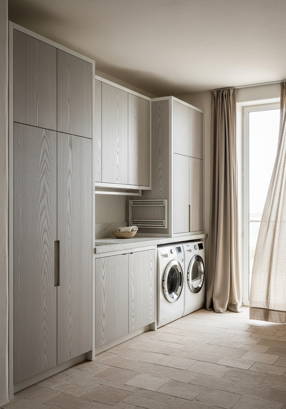 | Q: What cabinet depth is usually recommended for a laundry room cabinet? Recommended depth depends on the room type, circulation width, appliance adjacency, and storage brief. In most premium projects, depth is decided during layout review rather than copied from a catalog, because a better-fitting module plan improves both appearance and daily usability. |